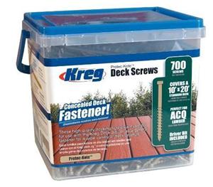 - Boks m/ 700 stk. høykvalitets ”protec-kote” terrassebord skruer som passer perfekt for bruk sammen med Kreg Deck Jig eller som en generell feste skrue for andre prosjekter. Protec-kote har tre anti-korrosjon lag kjemisk kombineres for å gi god beskyttelse mot rust og korrosjon for bruk utendørs. Perfekt for ACQ behandlet trelast. 700 skruer holder til ca. 18 m2 m/ ca. 40 cm mellom bjelkelaget. Inkl. screwbit.